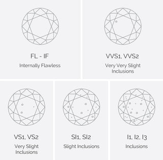 The last (but not least!) C is clarity. Clarity refers to the flaws (also known as inclusions) inside a diamond. Flaws or imperfections are graded based on their size, amount, type and relief (or how visible they are). These factors will significantly affect the grading and pricing of a diamond. Below is the chart that an experienced diamond grader will use to determine the clarity of a diamond: