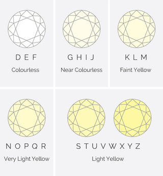 Diamonds come out of the earth in a multitude of colours, including vivid pinks, warm chocolates and crisp blues. However, the most common colours are clear (or white) to yellow. Diamonds in this range are graded on an alphabetical scale starting with D and continuing to Z (D being the clearest diamond lacking in any tint of colour). The clearest diamond will have the most value, and therefore the highest price tag. The illustration below shows this colour chart in more detail:
